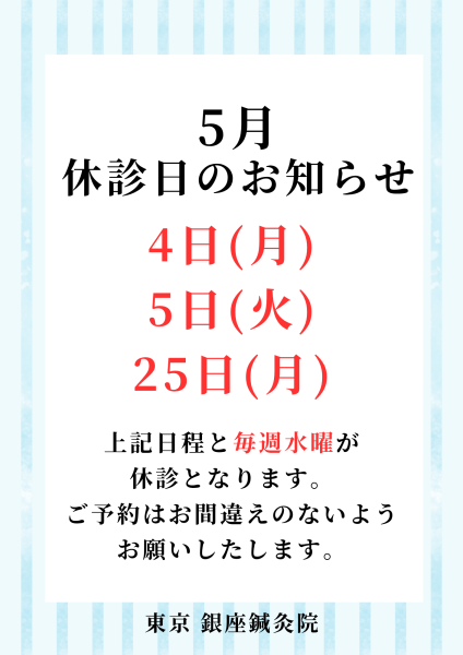 5月休診のお知らせ - 東京 銀座鍼灸院Ginza shinkyu