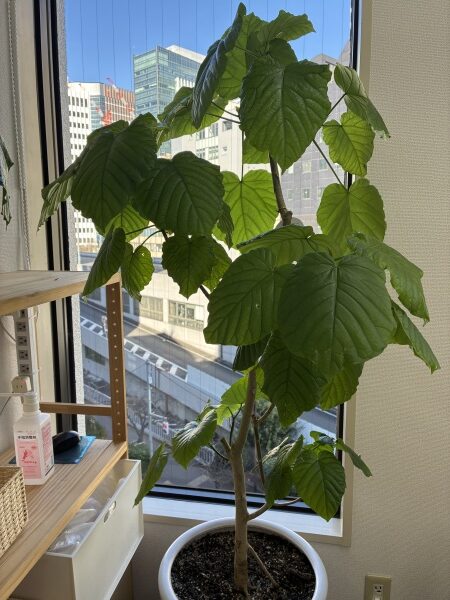 銀座鍼灸院の移転祝いにいただいた観葉植物の「ウンベラータ」は今年の夏に鉢を大きくしたら、葉っぱの付きも良くなりぐんぐん大きくなりました。