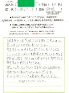 ジストニア/セネストパチー ジストニア セネストパチー 口蓋ジストニア(セネストパチー) 主訴:口顎ジストニア 年齢:50代/女性 住所:愛知県 主訴:鍼灸治療、動作改善法、指頭感覚法 病院でジストニア(口顎ジストニア)と診断され ボトックス注射を2度打ちましたが、 効果が見られず食いしばりもひどかった為 遠方なので連泊でこちらにお世話になりました。 院長はじめ先生方の優しい言葉がけに元気を頂き 症状もゆっくりながら緩和されていきました。 不安もあった中来て本当に良かったです。 またよろしくお願いします。