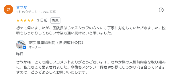 その他 その他 さやか様から嬉しい口コミを頂きました! Googleからの口コミを紹介させていただきます ⇩ 始めて伺いましたが、 医院長はじめスタッフの方々にも丁寧に対応していただきました。 説明もしっかりしてもらい今後も通い続けたいと思いました。 当院からの返信 ⇩ さやか様 とても嬉しいコメントありがとうございます。 さやか様の人柄前向きな取り組みに、私たちこそ励まされました。 今後もスタッフ一同さやか様にしっかり向き合っていきますので、 どうぞよろしくお願いいたします。